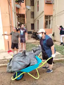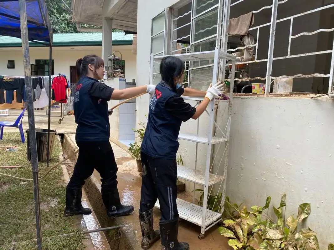 - July 8: The cleaning work was 80% completed. Six overseas short-term mission team members from 7979 Holistic Care Station of Tanjung Aru Calvary Charismatic Centre Kota Kinabalu joined as volunteers, helping with the cleaning and placing of damaged furniture into the RORO bins. In addition to cleaning, volunteers with electrical repairing skills checked household sockets for faults, as flood-damaged electrical appliances could pose risks like electrical leakage and short circuits. One volunteer, an electrician, assisted with this task.