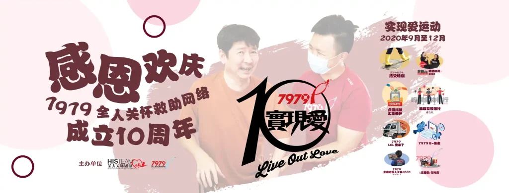 用一句话小结7979的首十年,是看到7979全人关怀站努力地实现爱。这爱不单是停留在言语,更是付诸于行动: 时间、精神、体力、财力、物力,都是将基督的爱向黑暗与绝望处照耀的举动。在这实现爱的旅程,我们感激一起同行的伙伴,也不断邀请教会参与,因为人人皆可实现爱,人人皆可7979。